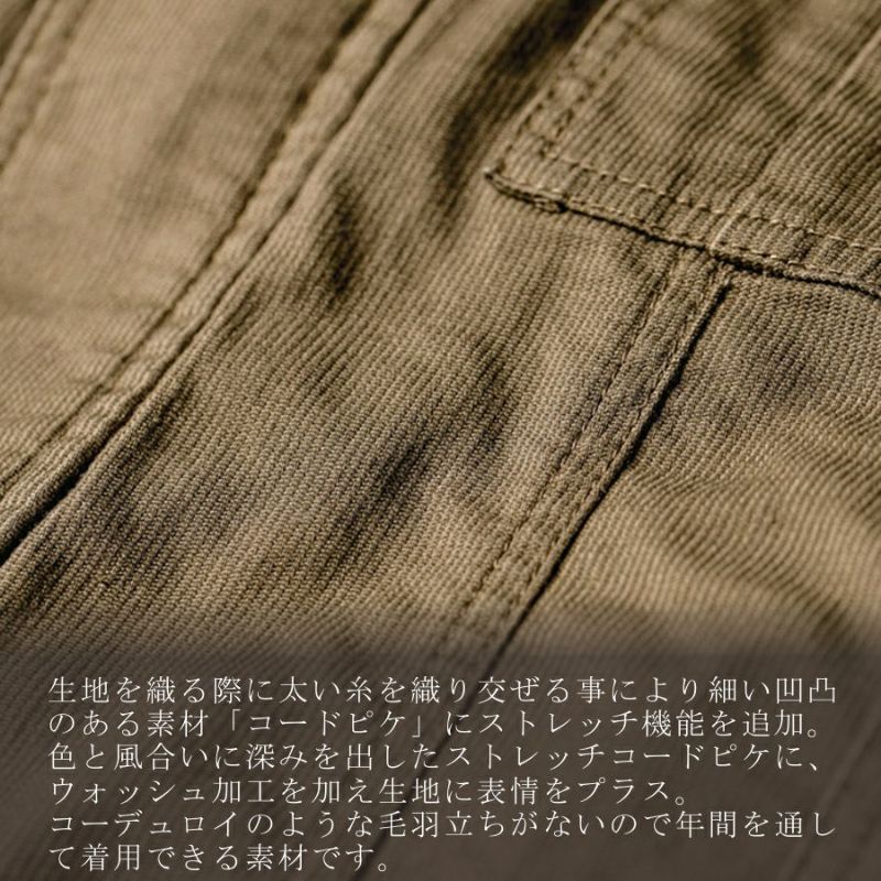 色と風合いに深みを出したストレッチコードピケに、ウォッシュ加工を加え生地に表情をプラス。