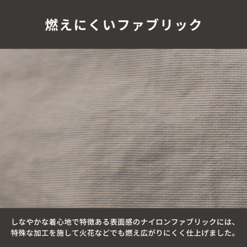 しなやかな着心地で特徴ある表面感のナイロンファブリックには、特殊な加工を施して火花などでも燃え広がりにくく仕上げました。