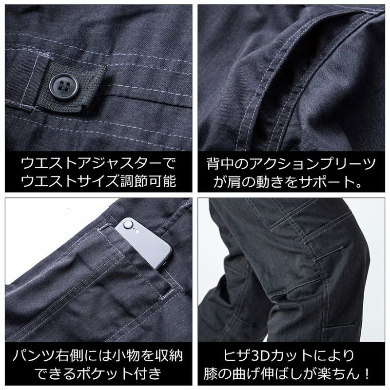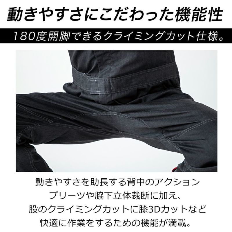 伸縮性がない生地だからこそ、動きやすさを助長する背中のアクションプリーツや脇下立体裁断に加え、 股のクライミングカットに膝3Dカットなど快適に作業をするための機能が満載されています。