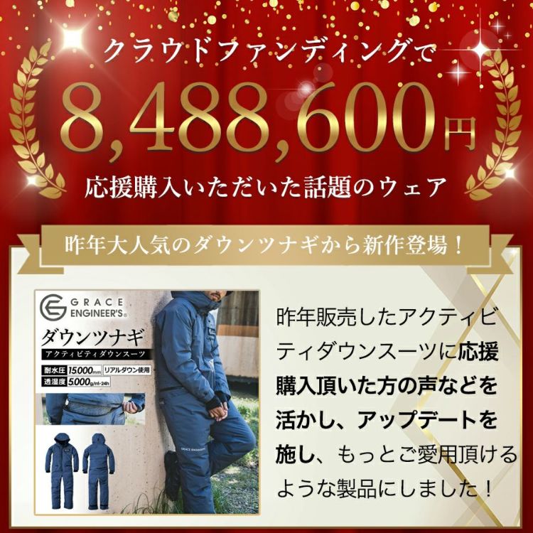 「グレイスエンジニアーズ」がキャンプや釣りなどのアウトドア向けの とにかく暖かい“全身ダウン”のツナギから2024年バージョンが新登場!! 1956年創業のツナギ専門メーカー「エスケー・プロダクト」が展開するブランド 「GRACE ENGINEER'S(グレースエンジニアーズ)」のノウハウを生かした、 キャンプや釣りなどのアウトドア向けのツナギ「アクティビティダウンスーツ」。 中綿には保温性が高く軽い650FPのダウンを全身にたっぷり使用。 表地には大雨にも対応可能レベルの高い防水性(耐水圧15,000mm)と、 不快なムレを逃がす透湿度5,000g/m2・24hのコーティング生地を使用しました。 寒さ知らずでアクティビティを楽しめる一着です。 「ツナギが暖かいのはわかるんだけど、トイレが面倒」