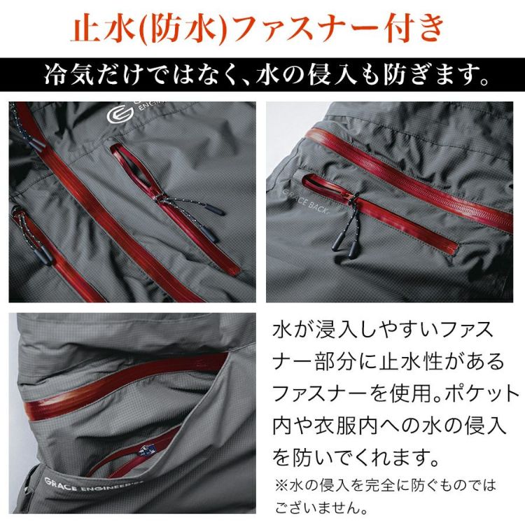 ダウンツナギは暖かいけど、トイレが…なんてお声を良く聞く事があります。 GRACE ENGINEER'Sが特許取得したヒップオープン機能『GRACE BACK』によって、 腰についているファスナーを開くことで、服を脱がずに用を足すことが出来るようになりました! 使用しているファスナーもYKKR製の止水ファスナーだから丈夫で耐久性も◎