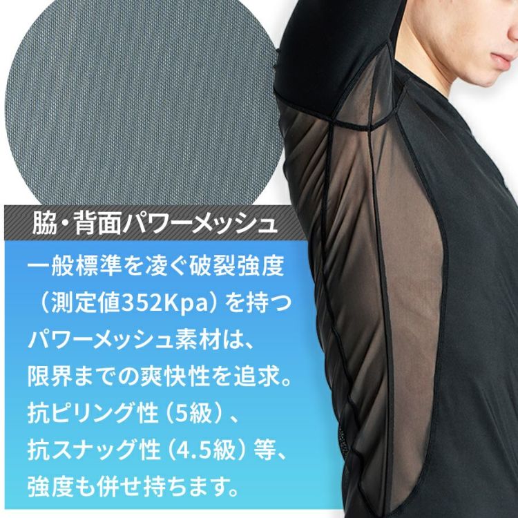 脇と背面の広範囲に破裂強度の高いパワーメッシュ素材を使用した薄手で通気性の高く肌感覚に近い清涼感を発揮する高機能インナーです。