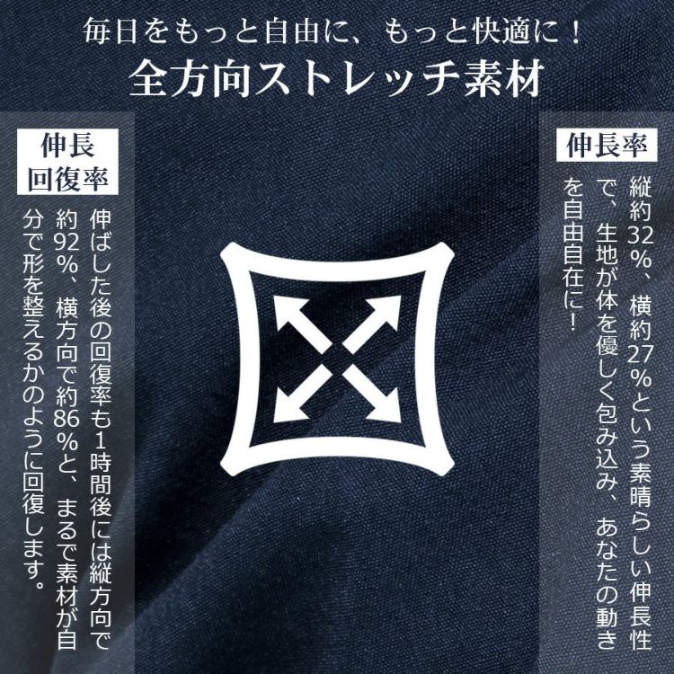 縦約32%、横約27%という素晴らしい伸長率で、生地が体を優しく包み込み、あなたの動きを自由自在にします。伸ばした後の回復率も1時間後には縦方向で約92%、横方向で約86%と、まるで素材が自分で形を整えるかのように回復します。