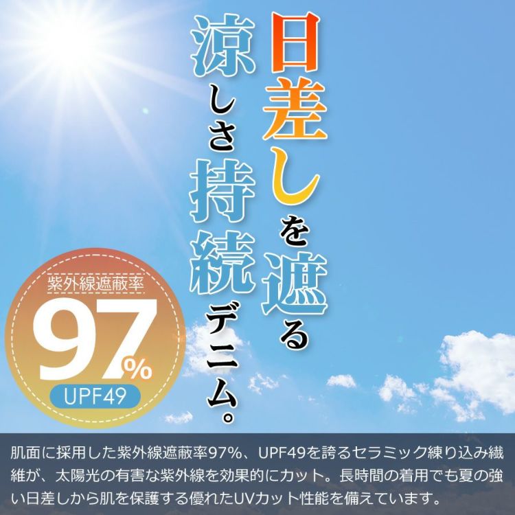 ・肌面に採用した紫外線遮蔽率97%、UPF49を誇るセラミック練り込み繊維が、太陽光の有害な紫外線を効果的にカットします。