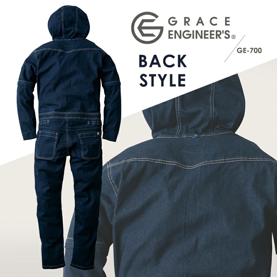 グレイスエンジニアーズ アグリデニム ツナギ GE-700 東京農大の学生が考案した新しいつなぎ メンズ レディース ユニセックス ヒップオープン ストレッチ フード付き 農業 ガーデニング アウトドア オーバーオール