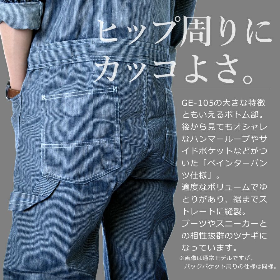 4L-5L グレイスエンジニアーズ ヒップオープン ヒッコリーツナギ GE-105H 綿100% メンズ レディース キッズ おしゃれ アウトドア キャンプ 焚火 作業服 作業着 腰割れ